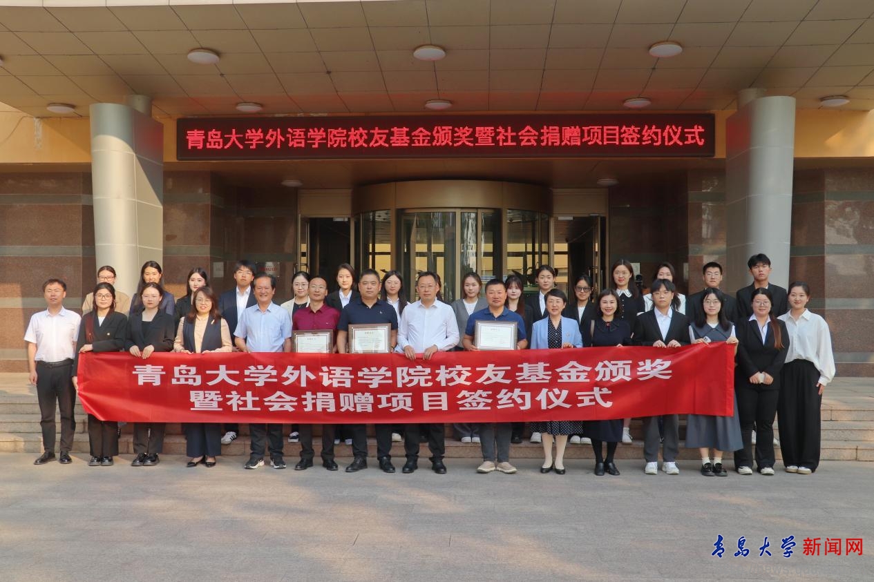 新闻网讯 5月29日下午,外语学院校友教育基金颁奖暨企业捐赠项目签约仪式在浮山校区办公楼407会议室举行。校党委常委、副校长刘恩贤出席活动并致辞。招远帝源服饰有限公司总经理、96级日语系校友李永胜,青岛智邦慧海文化传播有限公司总经理王军,上海文策信息科技有限公司授权代表、2002级计算机系校友蔡世禄、学校相关部门负责人、外语学院获奖师生代表等出席活动。