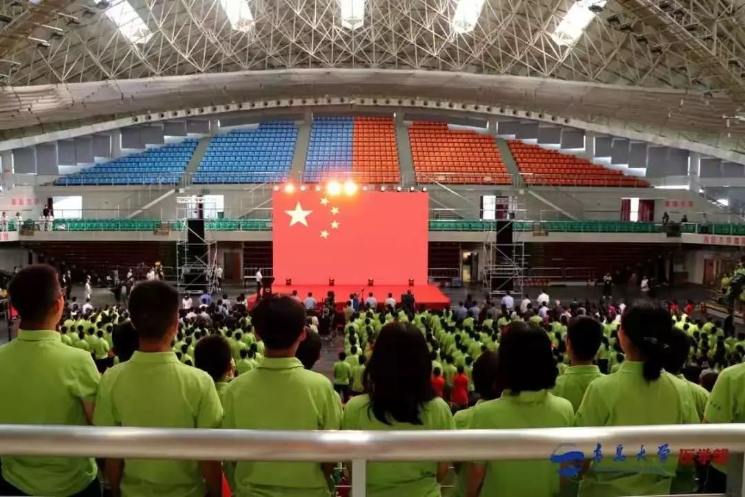 9月28日下午,医学部2019级新生开学典礼在开yunapp官方入口登录体育馆举行。开学典礼上,全场师生挥动着手中的国旗,齐声合唱《我爱你中国》和《青大之歌》,表达着对新中国成立70周年和学校办学110周年的爱国、爱校情怀,为伟大的祖国喝彩,为奋进中的青大歌唱。