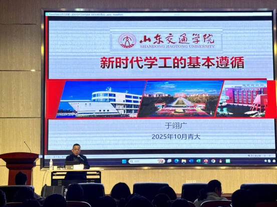 为深入推进辅导员队伍专业化与职业化建设,增强新时代背景下学生工作的理论素养与实践能力,2025年10月23日下午,学生工作处在浩园医学教育综合楼一楼报告厅举办第八期辅导员发展论坛。论坛特邀山东交通学院产教融合办公室主任于翊广,以新时代学工的基本遵循为主题做专题报告。各学院分管学生工作领导、全体辅导员参加。